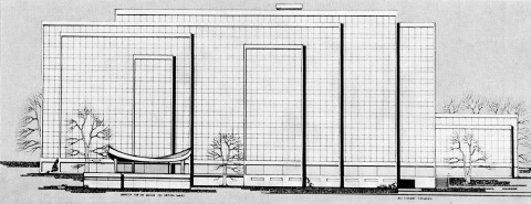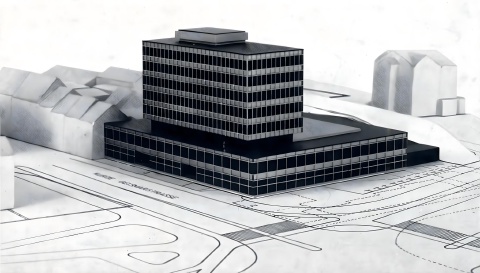 Das Modell zeigt einen zentralen Turm mit einem breiten Sockel an dessen Stelle heute das Hauptgebäude steht. Und eine Reihe von damit verbundenen Nebengebäuden im Norden. Das Parkdeck im Vordergrund ist das einzige, das man an diesem Entwurf heute wiedererkennen kann.