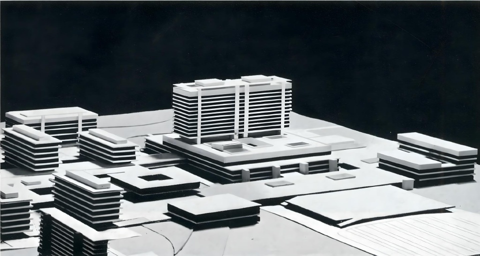 Das Modell zeigt einen zentralen Turm mit einem breiten Sockel an dessen Stelle heute das Hauptgebäude steht. Und eine Reihe von damit verbundenen Nebengebäuden im Norden. Das Parkdeck im Vordergrund ist das einzige, das man an diesem Entwurf heute wiedererkennen kann.
